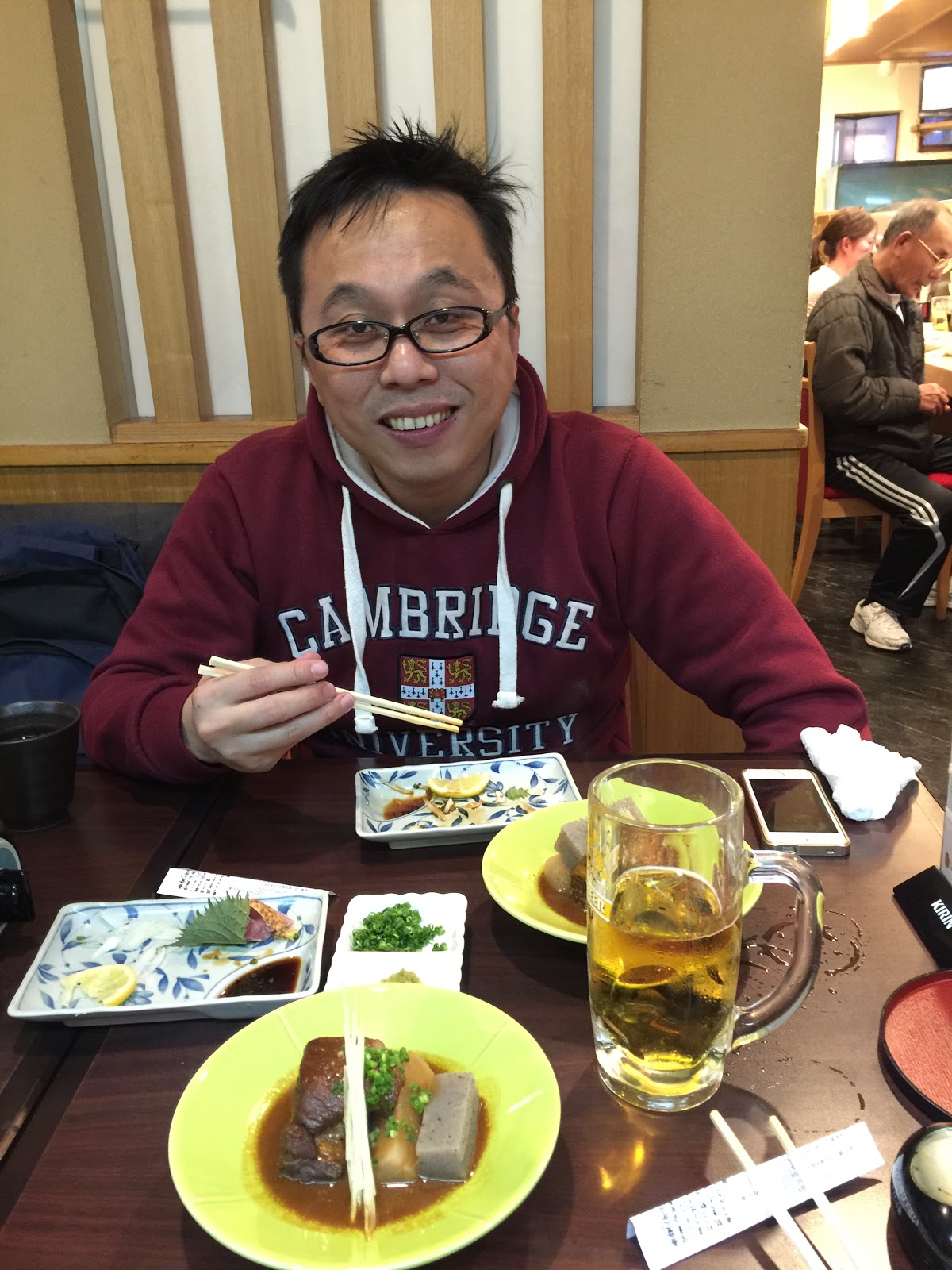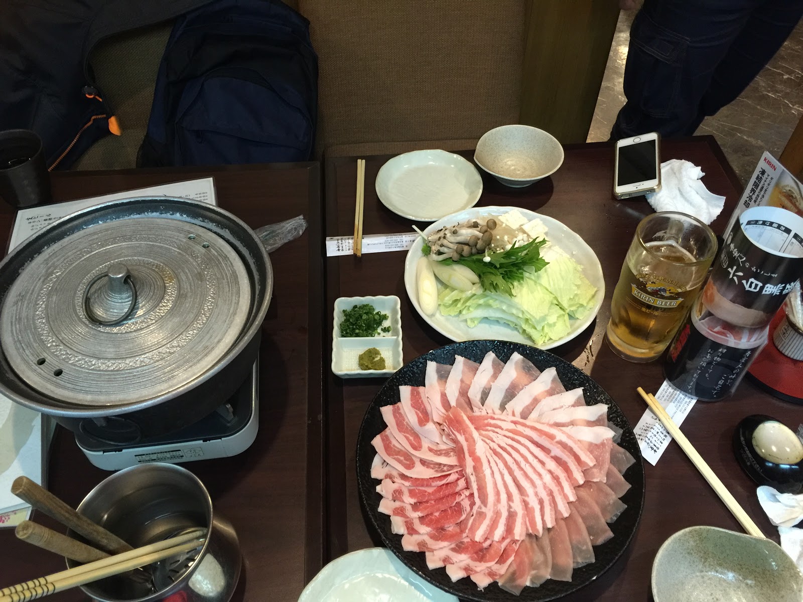 卸下行李後 我們就到外面覓食, 往天文館通方向走去,過了馬路到對面巷子,到處都是餐廳,老公看見一家"吾愛人", 是網路上好像有推荐過的,我們不猶豫地進去吃了. 點了當地有名的鄉土料理和極上六白黑豬火鍋, 這在鹿兒島的第一餐連啤酒花了日幣11000, 我們對自己很好吧~ 顆顆