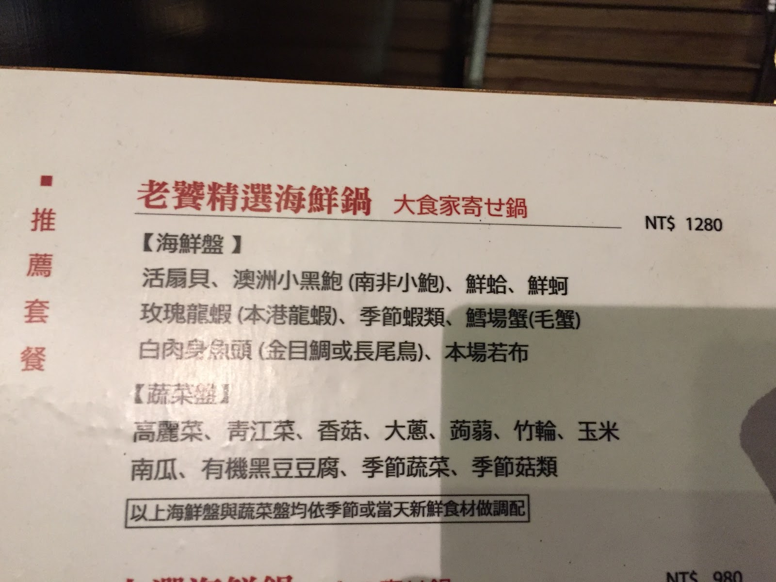 我們兩個人 點一個1680的精選海陸鍋(裡面搭配的其實就是一份老饕精選海鮮鍋加上一份肉類) 份量就超夠了~ 但是共鍋還有300塊的費用~ 我們就再加點一個320塊的生魚片來抵消費就行了 (或者也可以點飲料來抵)