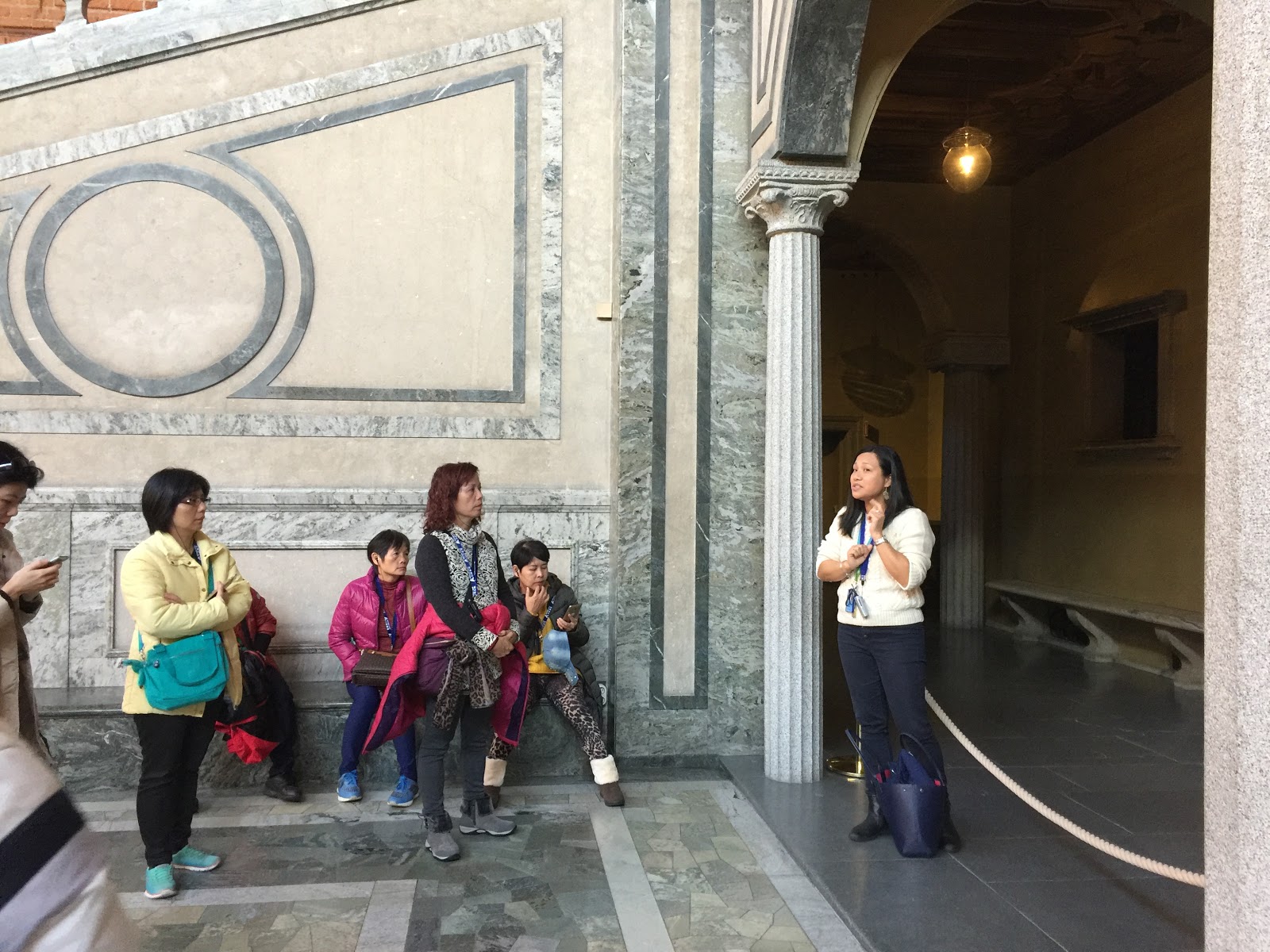 這個是導遊在介紹市政廳內有名的藍廳(但牆面是磚紅的 不藍 哈哈),是諾貝爾頒獎完後舉行晚宴的會場~ 說是世界上最擁擠的晚餐~ 很難想像幾千人擠在裡面用餐的場面~